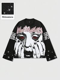 Street Life Men's Graphic Gothic Jesus Print Rhinestone Decor Crew Neck Loose Fit Casual Pullover Sweatshirt