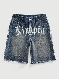 Street Life Men's Sparkling Letter & Diamond Decor Loose Fit Denim Shorts