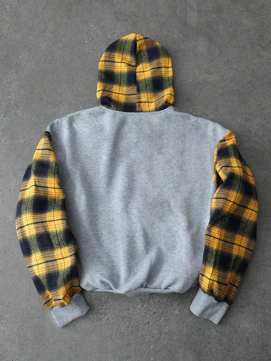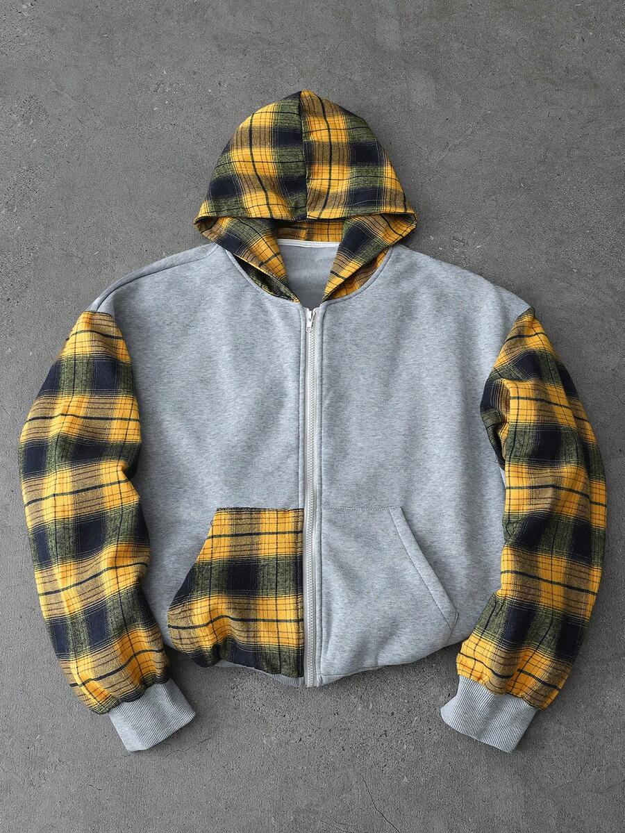 Street Life Men's Contrast Color Zipper Long Sleeve Plaid Patchwork Hoodie, Autumn/Winter