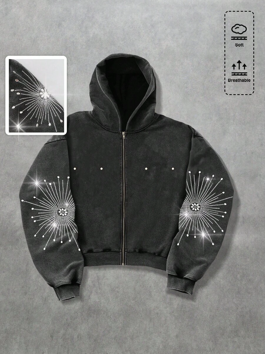 Street Life Men's Distressed Rhinestone Washed Loose Sweatshirt, Vintage Street Style, Fall