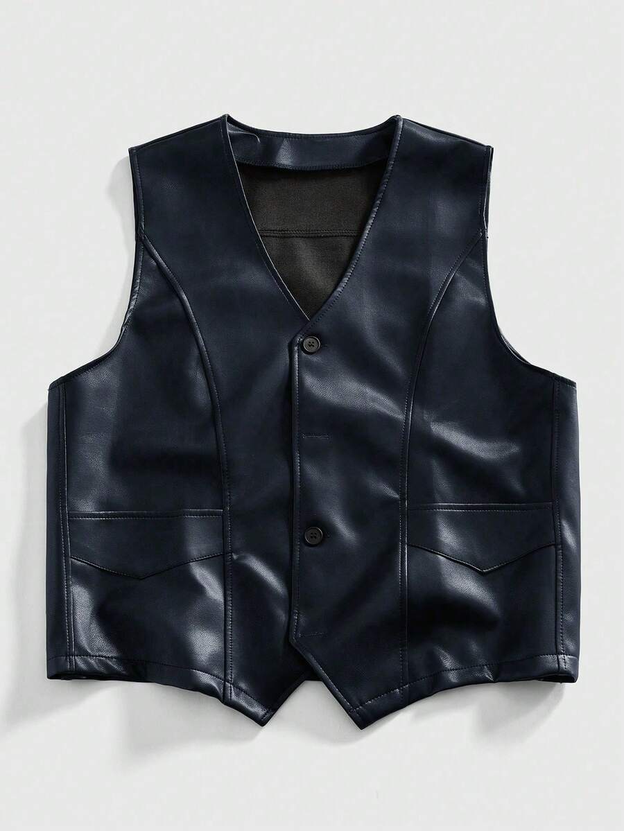 Street Life Men's Solid Color PU Leather Casual Vest With Front Buttons, Street Fashion