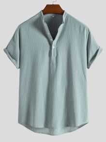 Men Striped Half Button High Low Shirt Short Sleeve Casual Shirt For Boyfriend Gift