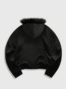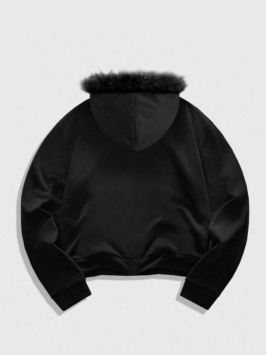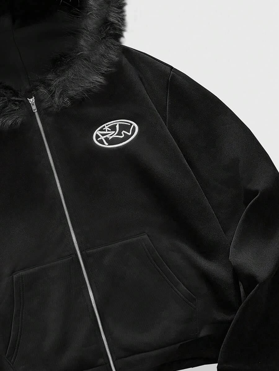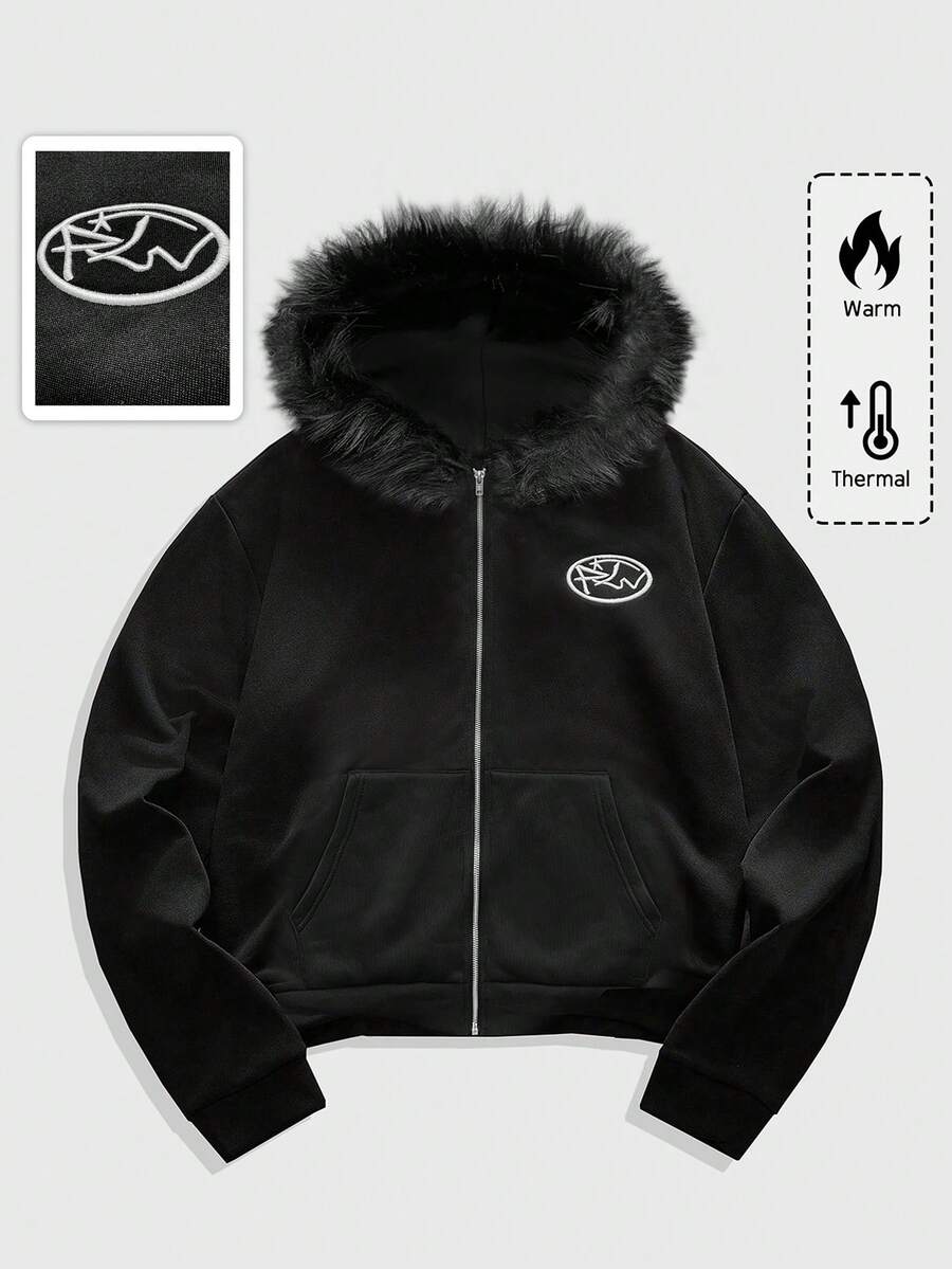 Men's Autumn/Winter Embroidered Zip-Up Hooded Sweatshirt With Fur Collar