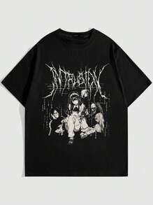 Anime Men's Cartoon Character & Letter Print Round Neck Short Sleeve T-Shirt, School, 2000s Style