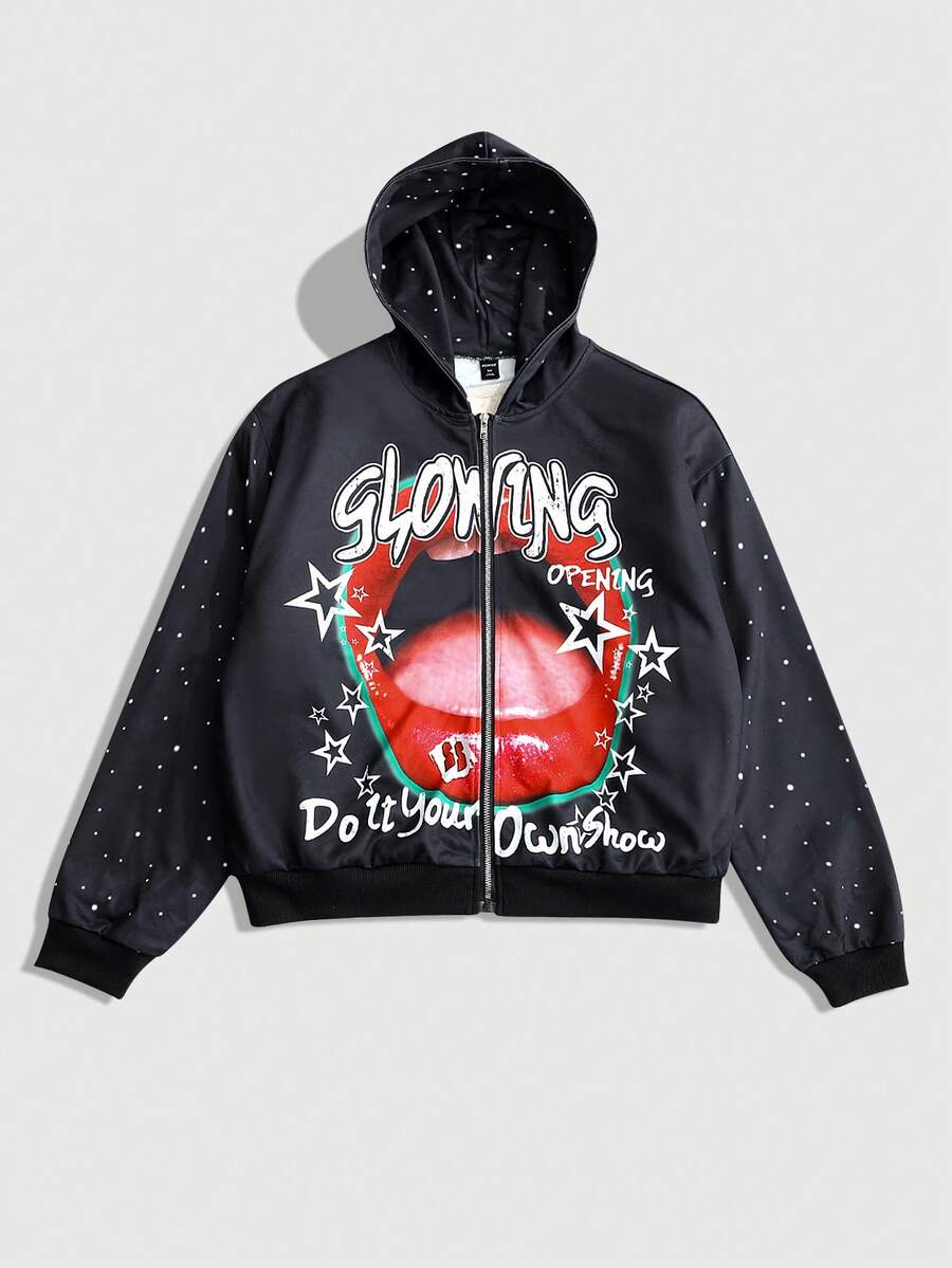 Men's Casual Letter & Lip Print Zip-Up Hoodie, Autumn/Winter