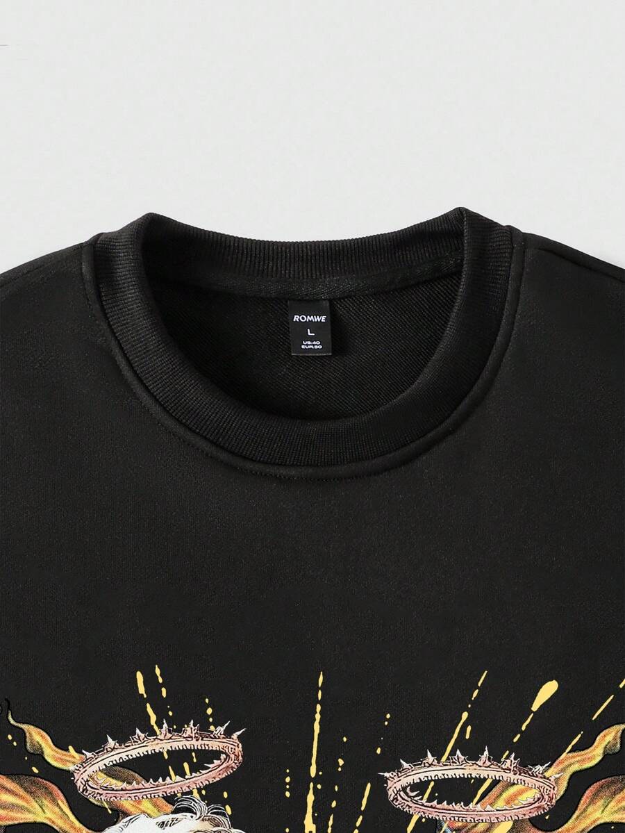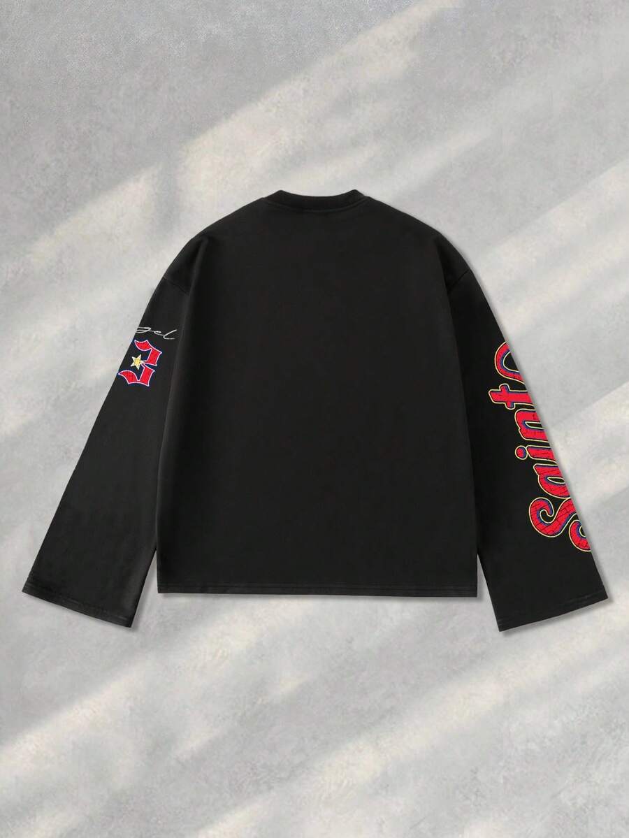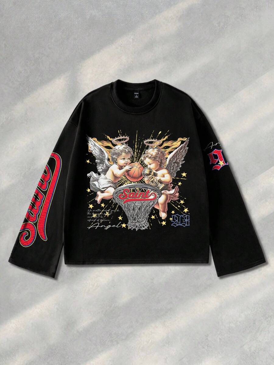 Street Life Men Casual Loose Fit Angel Letter Print Round Neck Long Sleeve T-Shirt, Fall