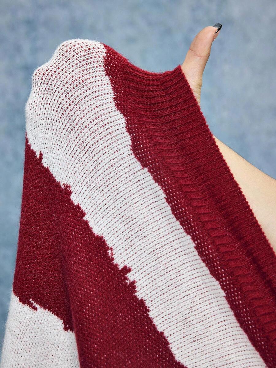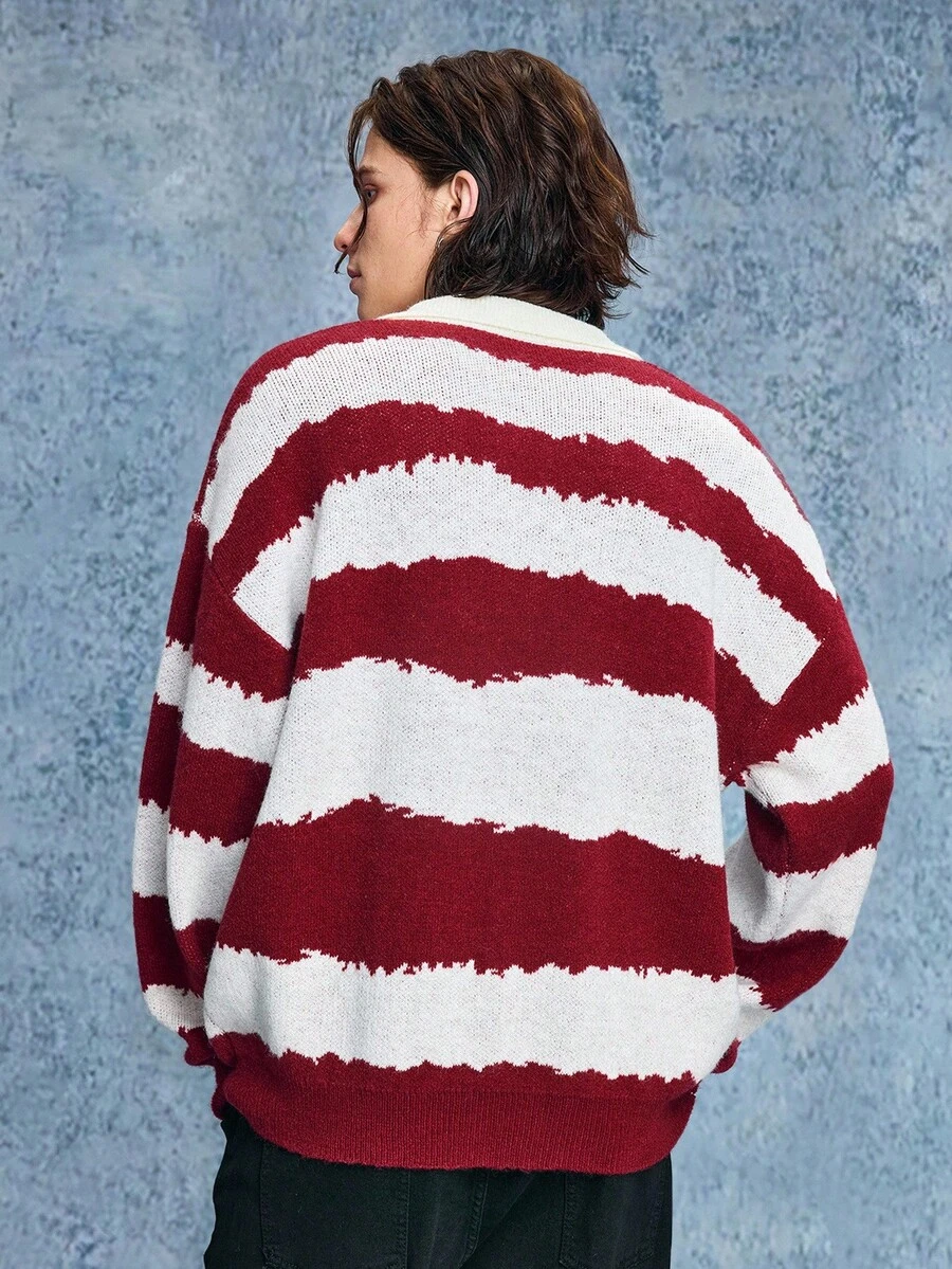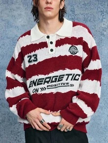 Men's Casual Prep Letter & Striped Drop Shoulder Long Sleeve Polo Neck Sweater, Autumn