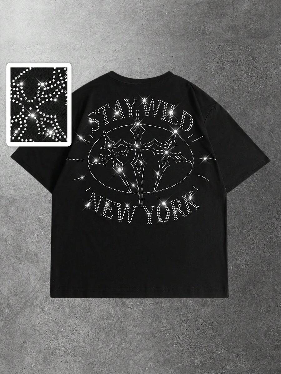 Men's Cross & Letter Rhinestone Embellished Short Sleeve T-Shirt