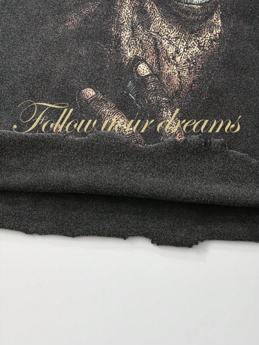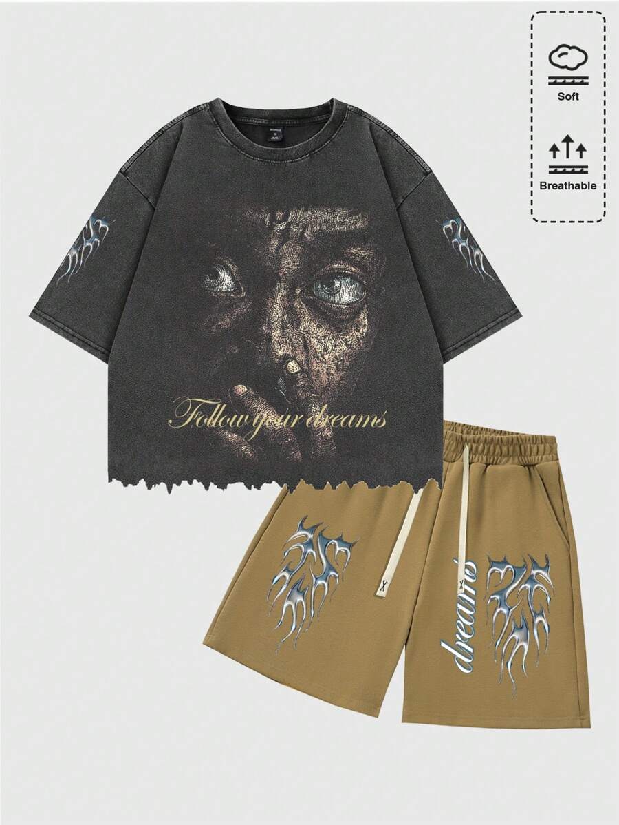 Men's Letter & Figure Print Washed Distressed T-Shirt And Shorts Casual Set