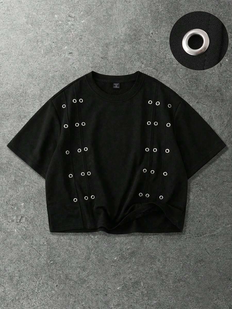 Men's Metal Grommet Loose Fit Round Neck Black Short Sleeve T-Shirt