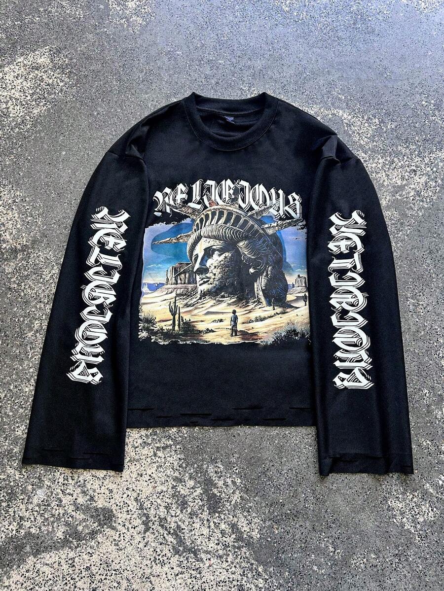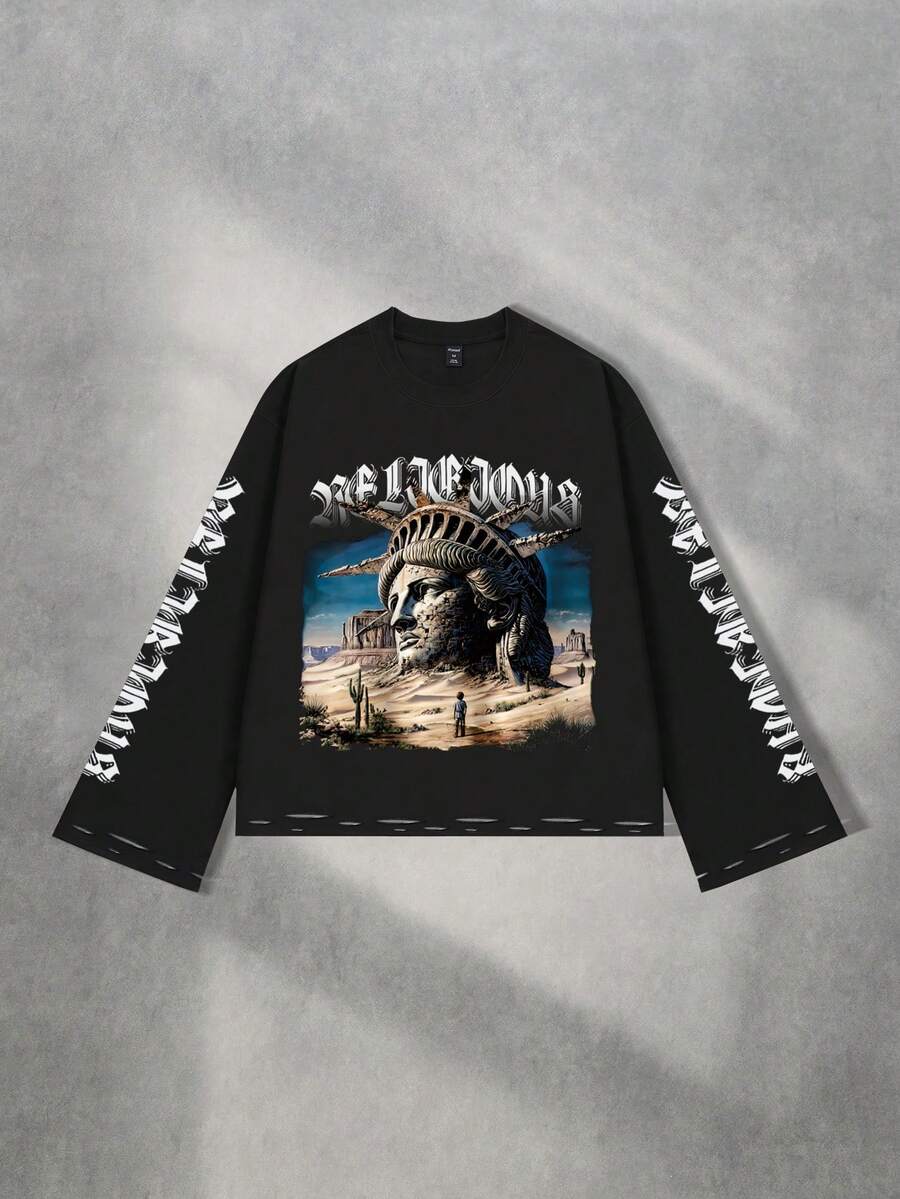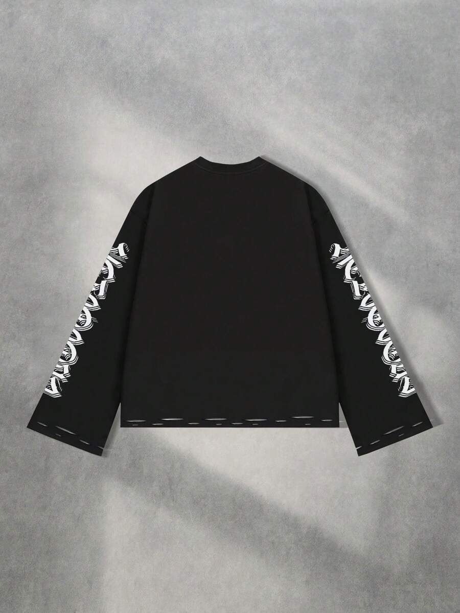 Men's Round Neck Street Character Print Distressed Long Sleeve T-Shirt