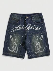 Men's Street Life Rhinestone Letter Print Denim Shorts