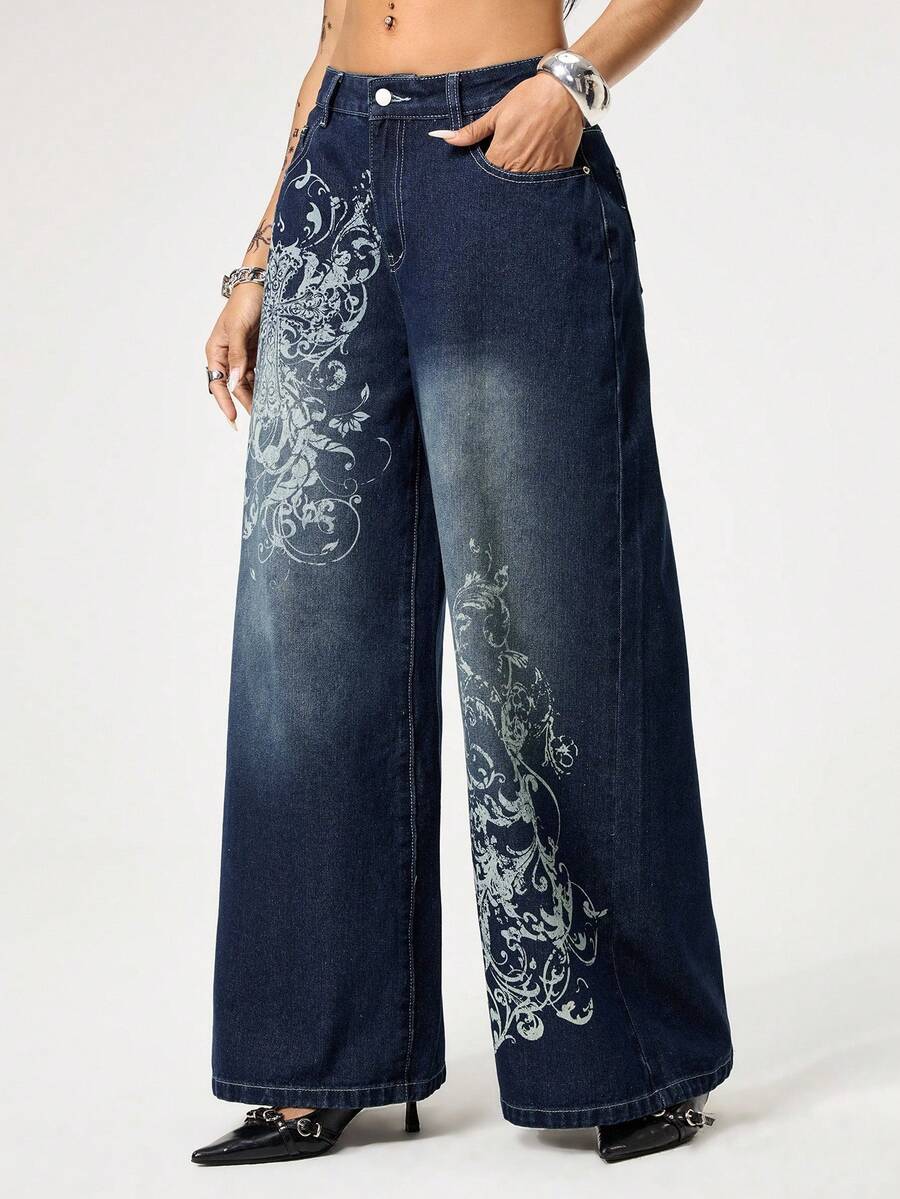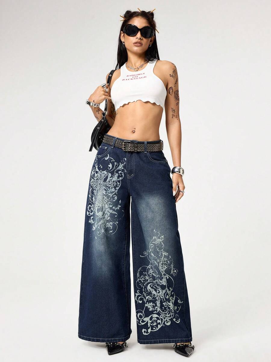 Grunge Punk Oversized Street Grunge Distressed Vintage Cross & Vine Print Loose Fit Women Jeans