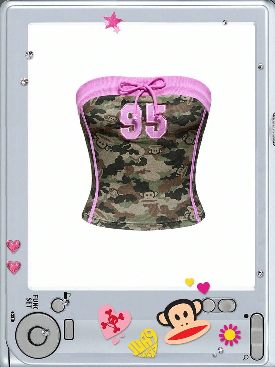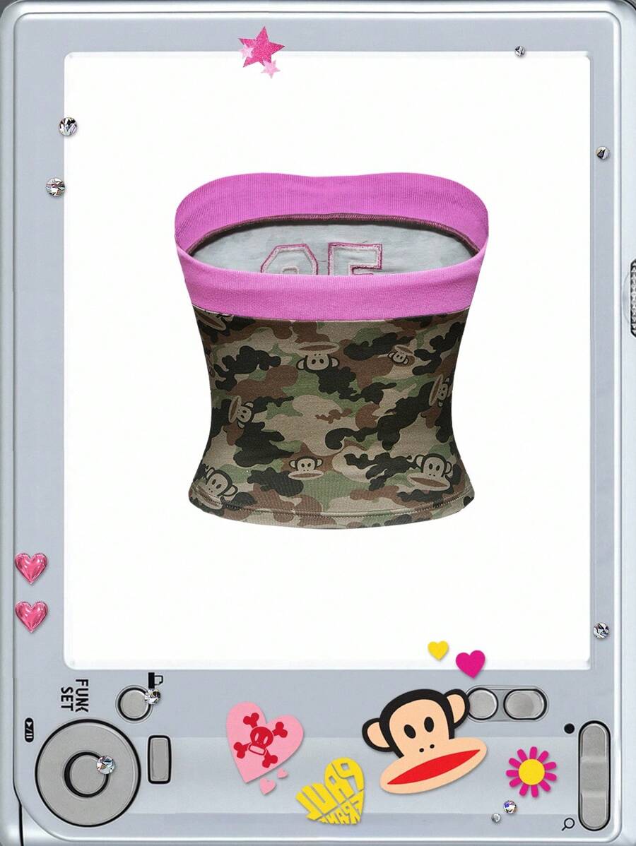 Paul Frank X ROMWE Y2K Cute Camouflage & Numeric Pattern Tight Tube Crop Top