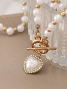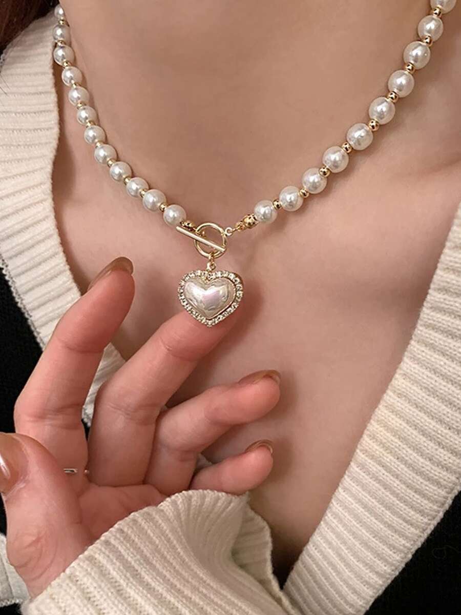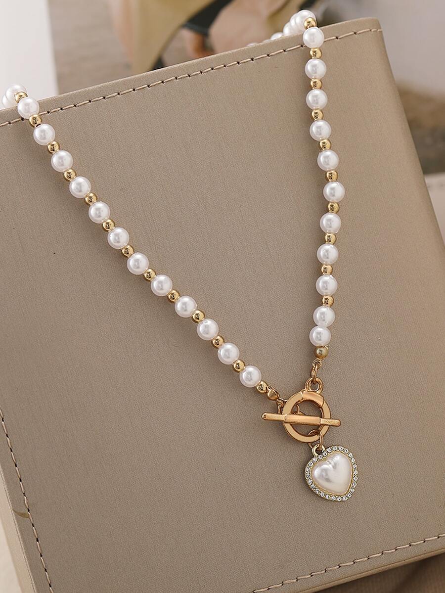 Rhinestone Heart Charm Faux Pearl Beaded Necklace