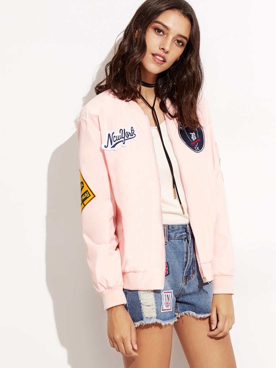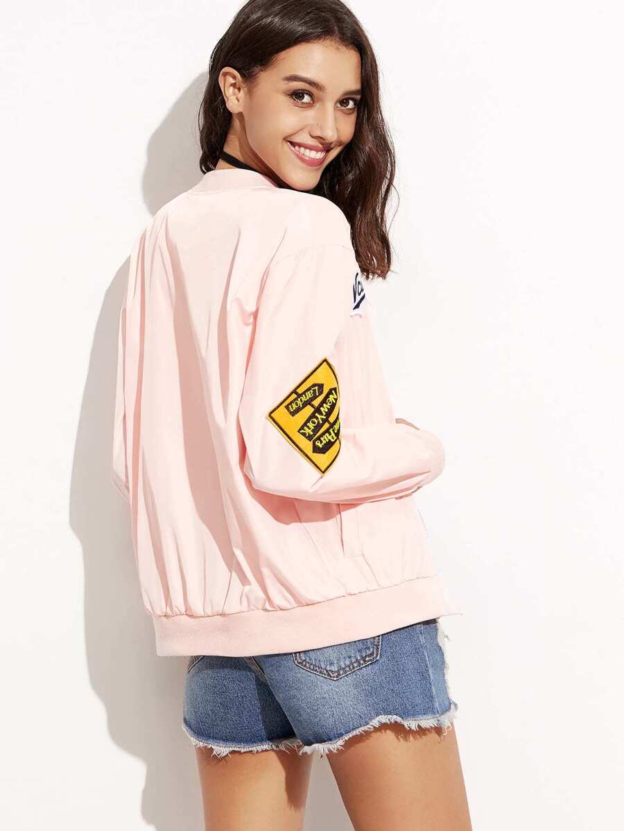 Pink Embroidered Patch Zipper Bomber Jacket