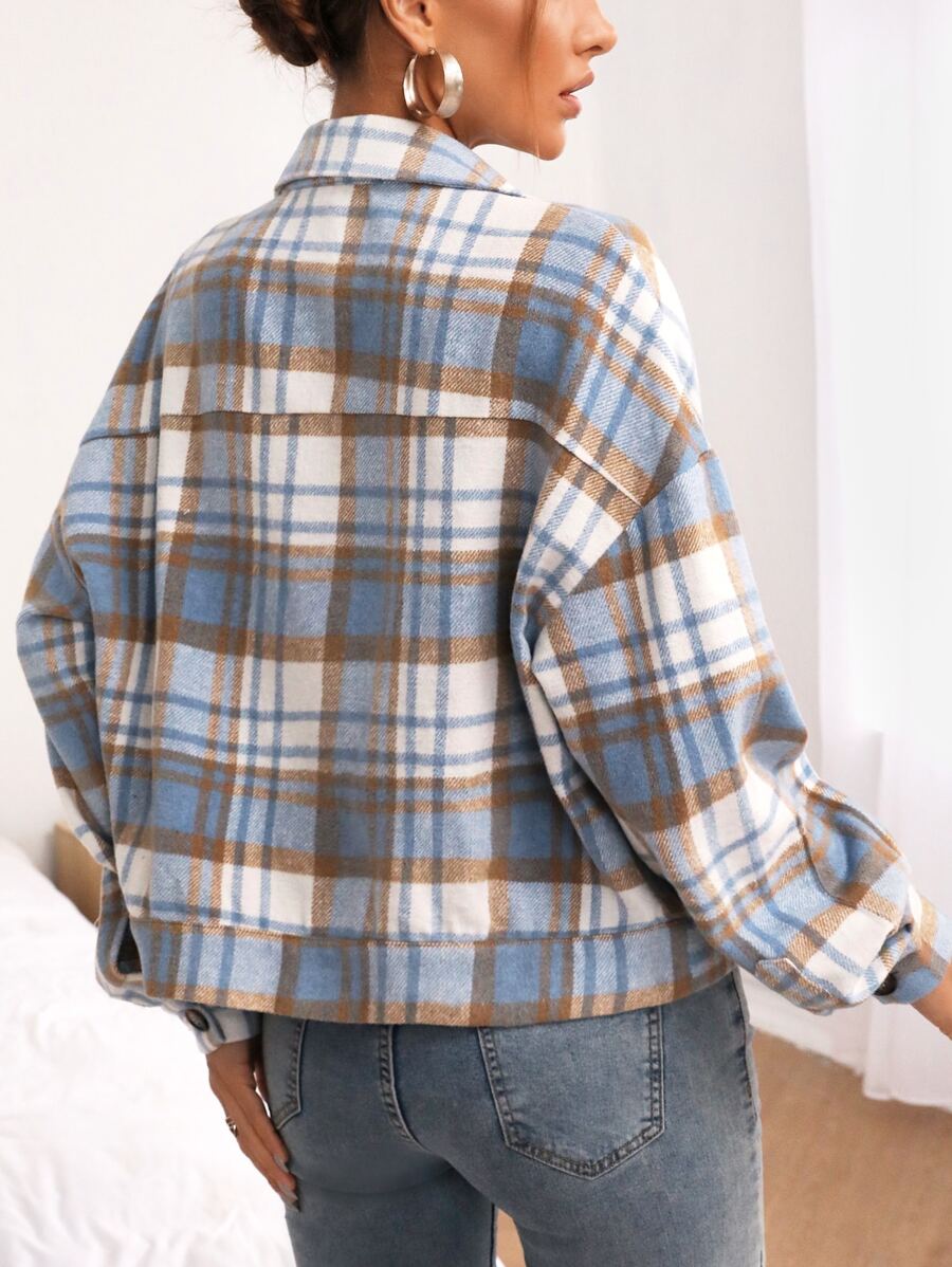 Plaid Flap Pocket Drop Shoulder Jacket