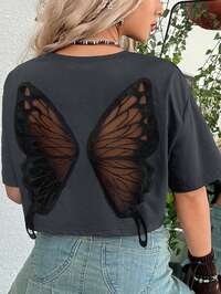 Fairycore Oversize Women's Summer Vacation Hippie Style Butterfly Net Mesh Splice Drop Shoulder T-Shirt, Plus Size