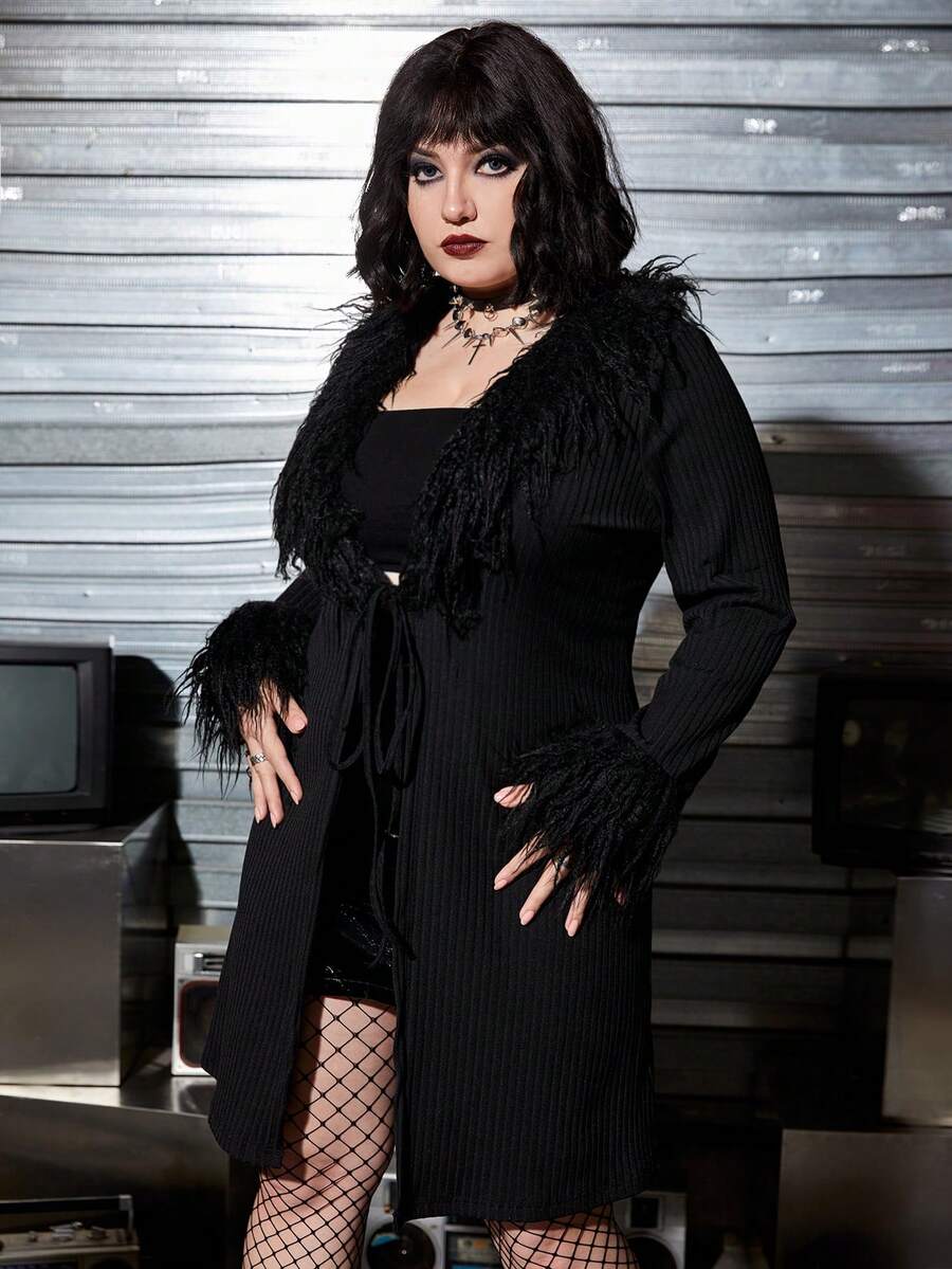 Plus 1pc Fuzzy Trim Knot Front Faux Feather Detail Open Front Coat