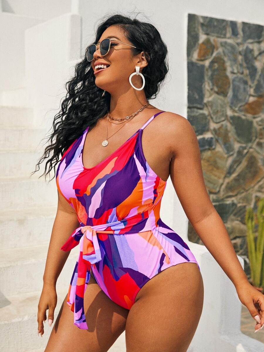 Plus Allover Graphic Knot Front One Piece Swimsuit, For Summer Beach Vacation