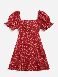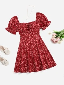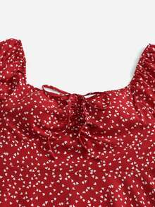 Plus Allover Heart Print Flounce Sleeve Drawstring Ruched Front Dress