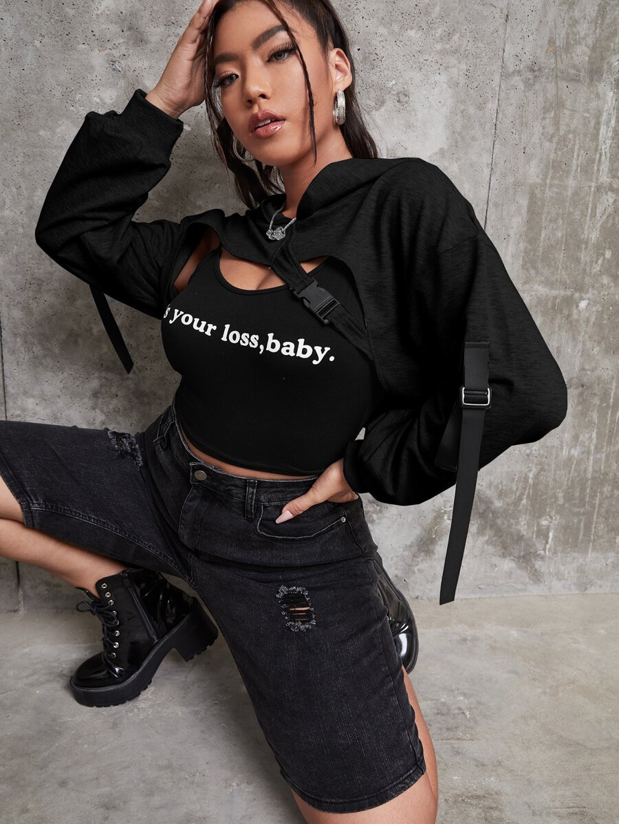 Plus Buckle Tape Cut Out Super Crop Hooded Sweatshirt