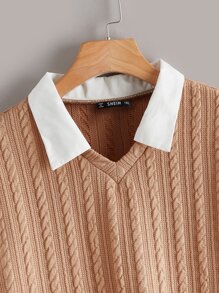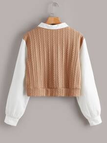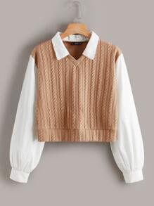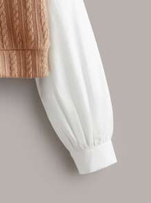 Plus Color Block Lantern Sleeve Cable Knit 2 In 1 Blouse