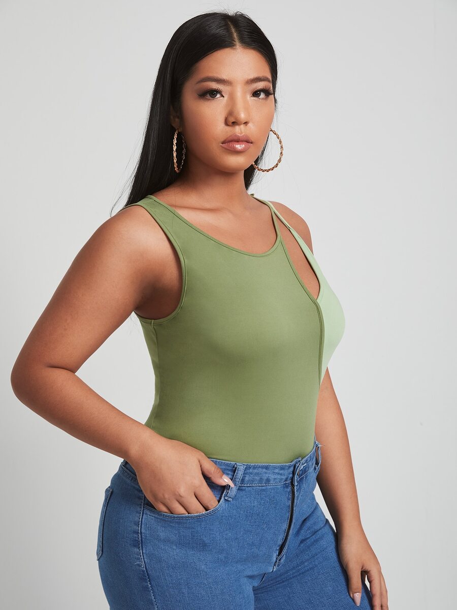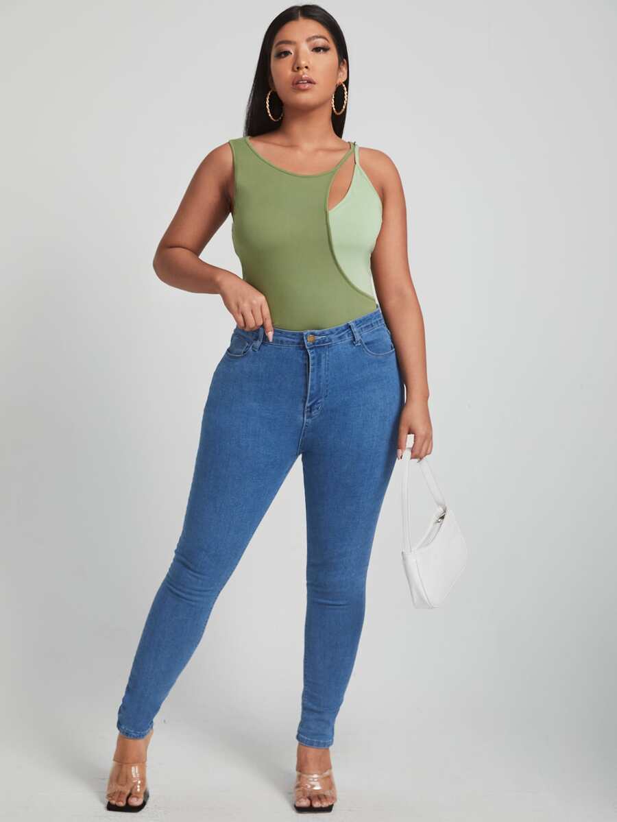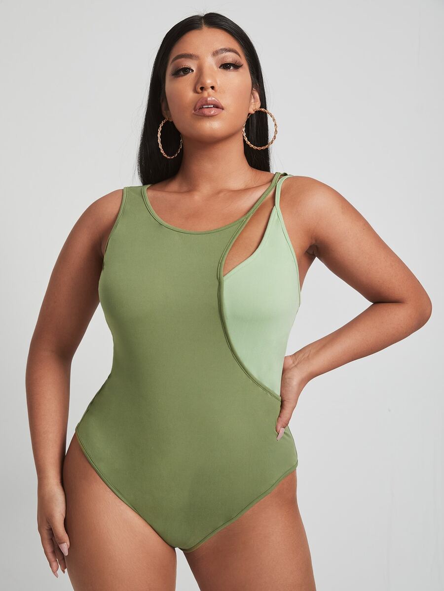 Plus Contrast Panel Asymmetrical Neck Bodysuit