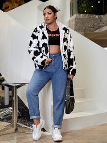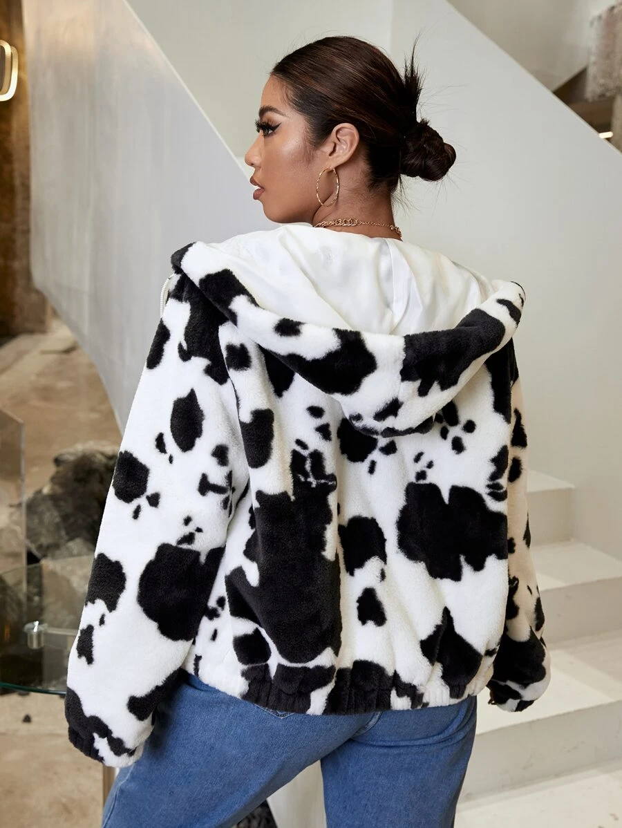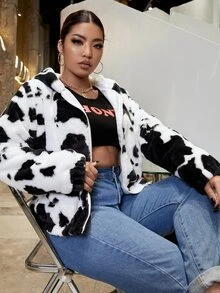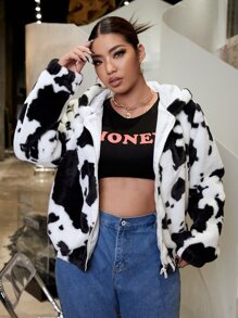 Plus Cow Print Hooded Fuzzy Coat