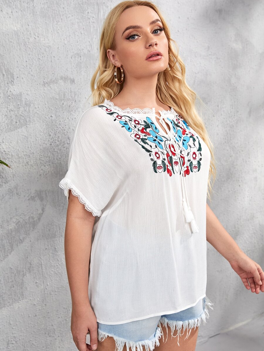 Plus Floral Embroidery Tassel Tie Neck Lace Trim Blouse