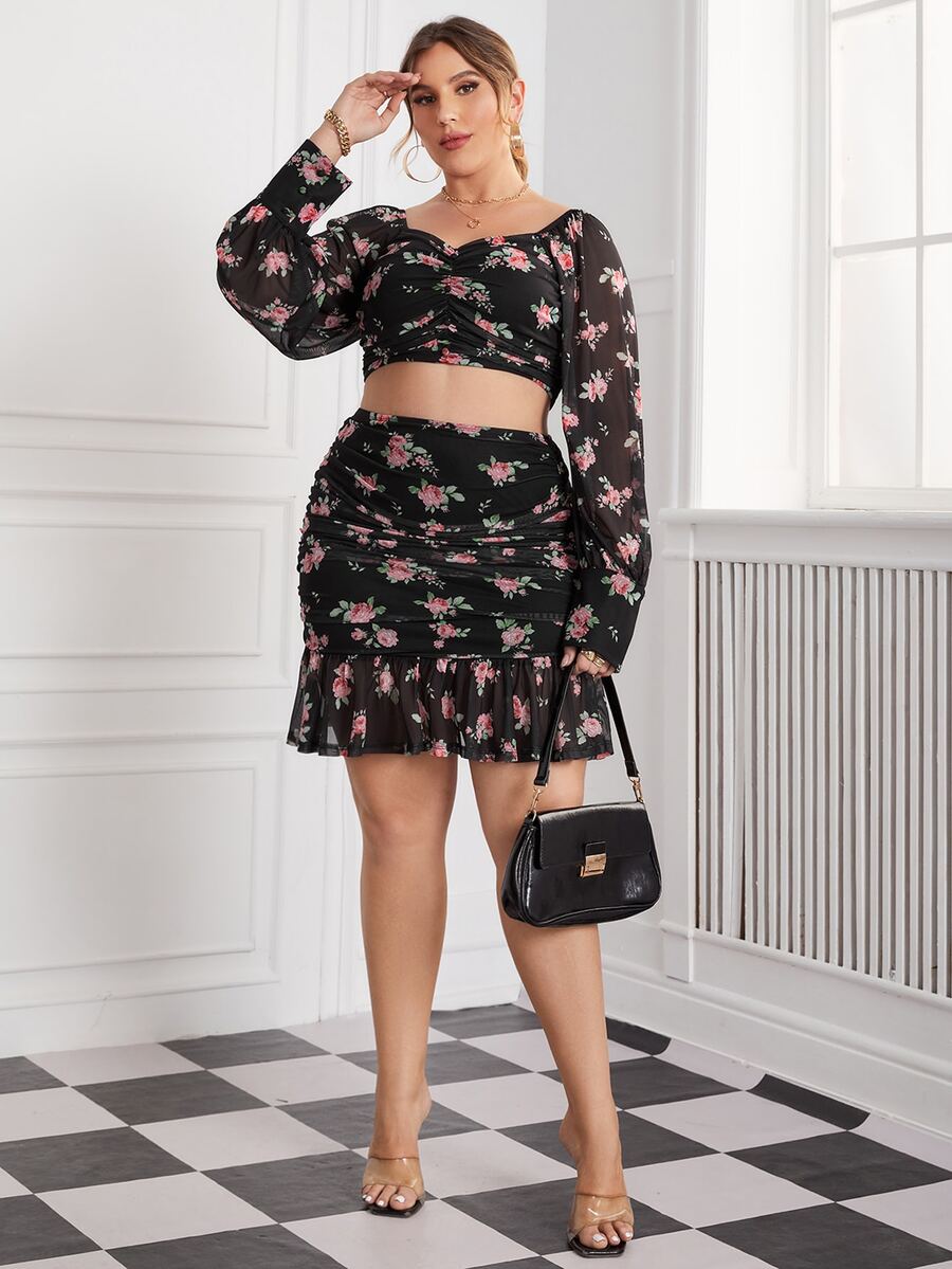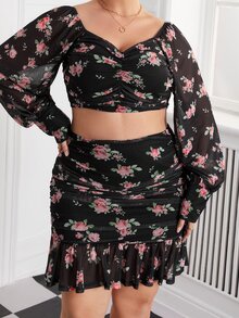 Plus Floral Print Ruched Bust Crop Mesh Top & Skirt Set