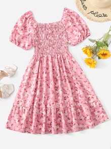 Plus Floral Print Shirred Puff Sleeve Ruffle Hem Summer Boho Dress