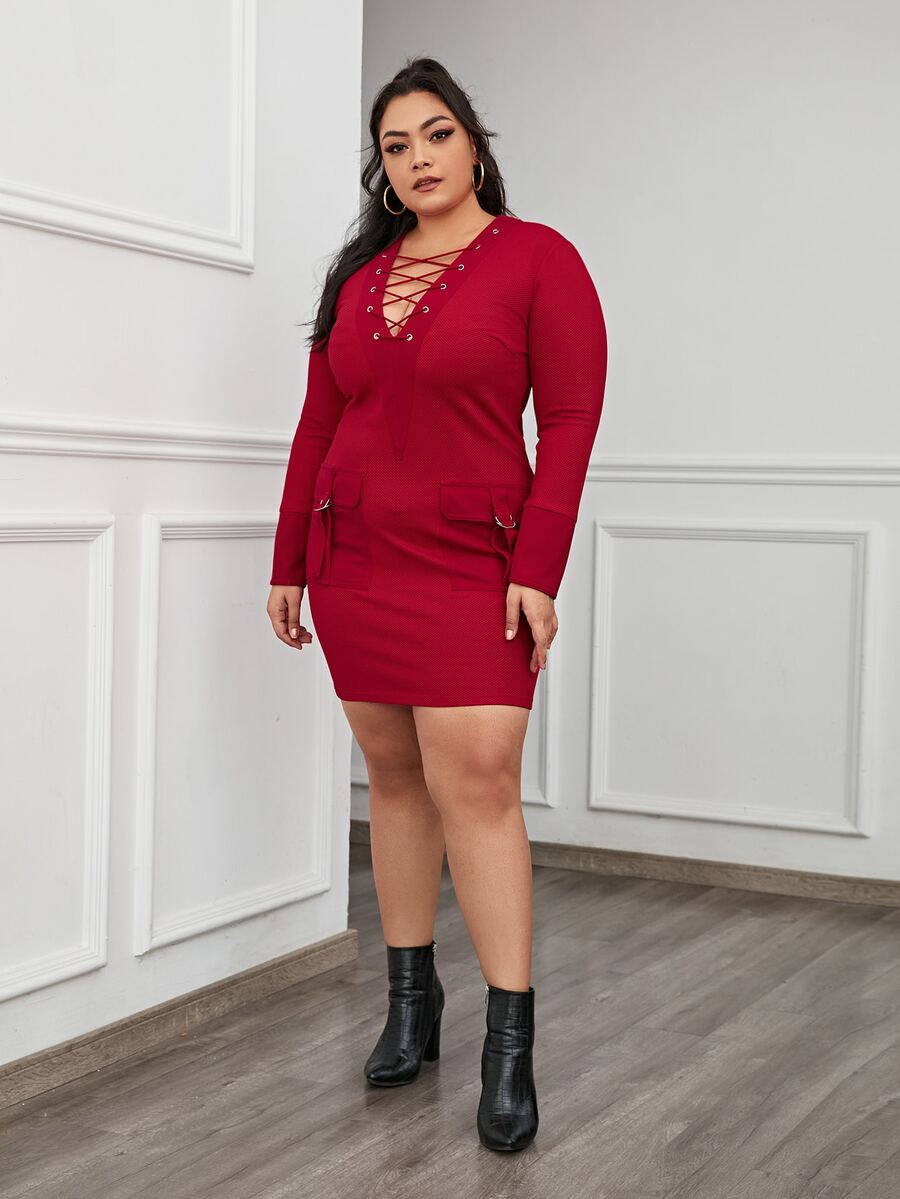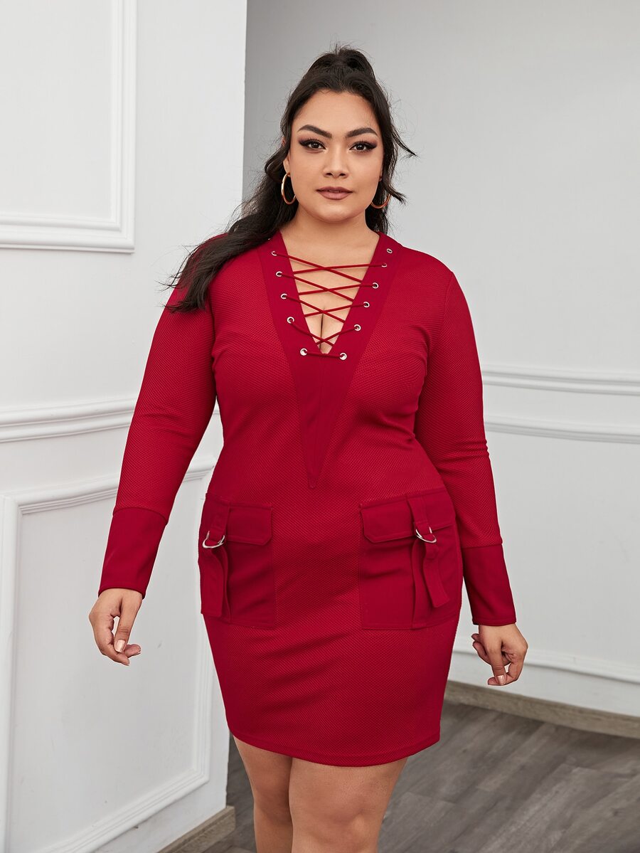 Plus Grommet Eyelet Lace Up Front Flap Pocket Patched Dress