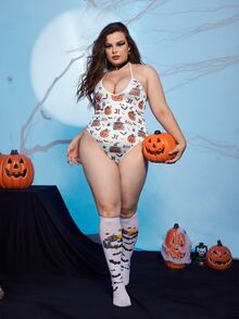Plus Halloween Pumpkin Print Teddy Bodysuit