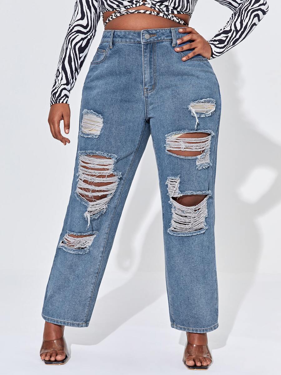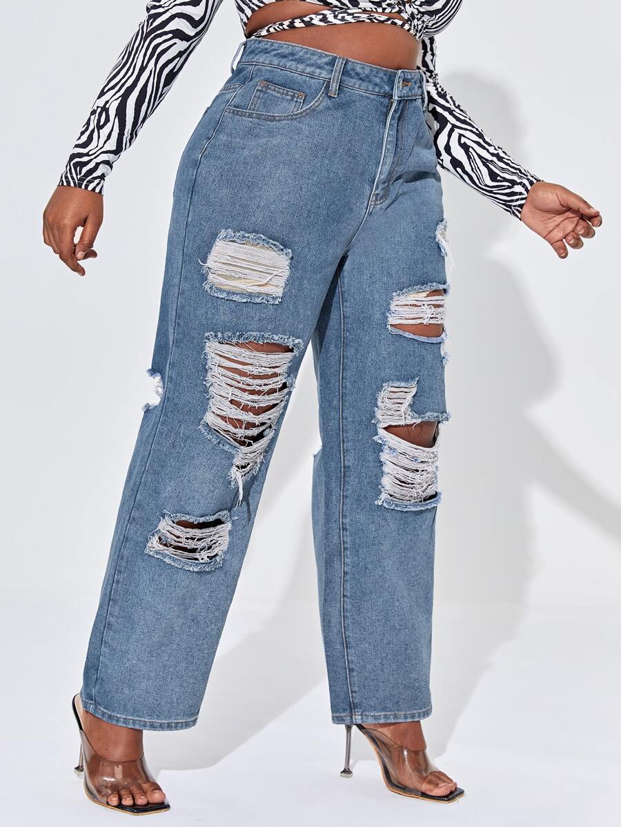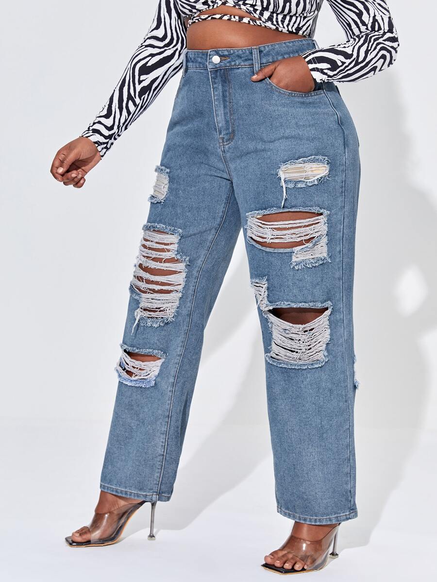 Plus High Waist Ripped Frayed Straight Leg Jeans