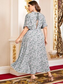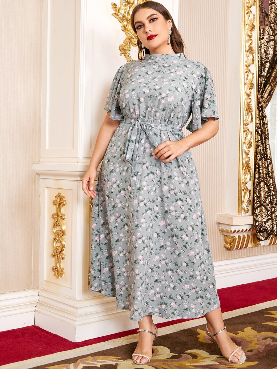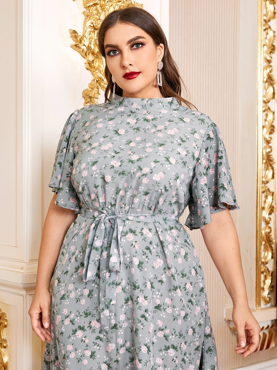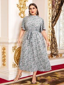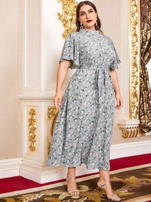 Plus Mock-neck Flutter Sleeve Self Belted Dress