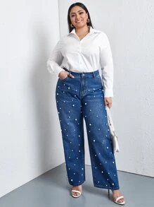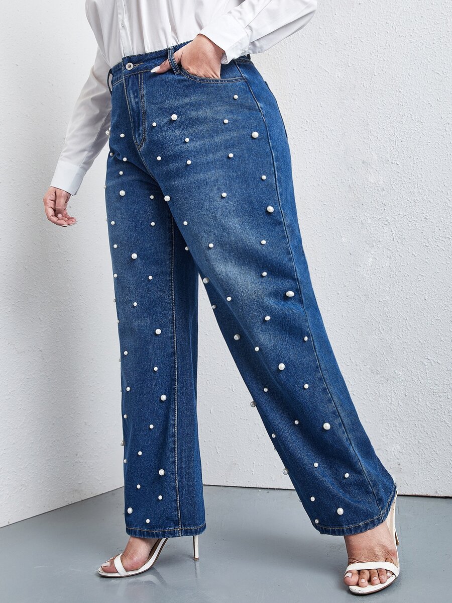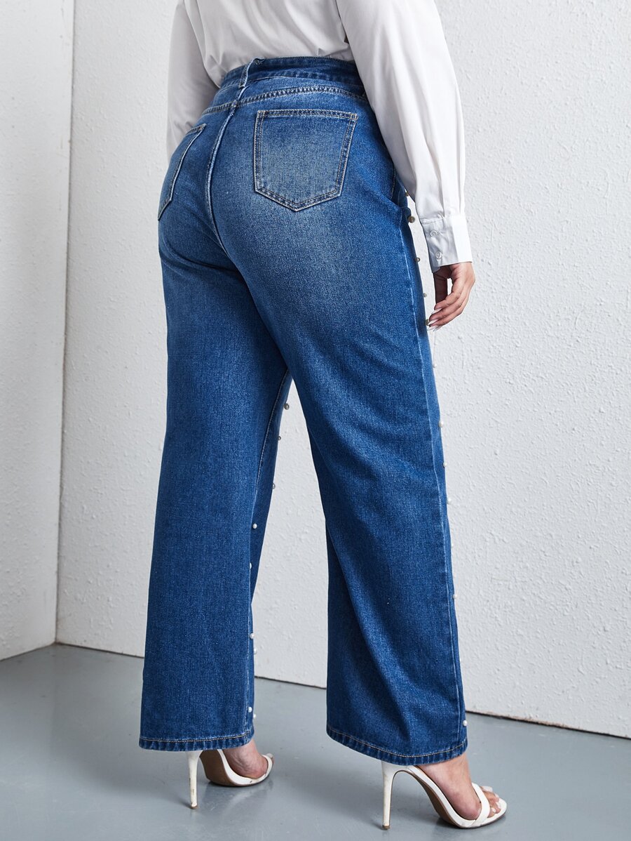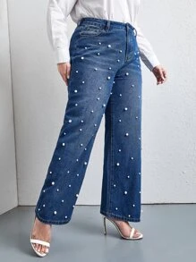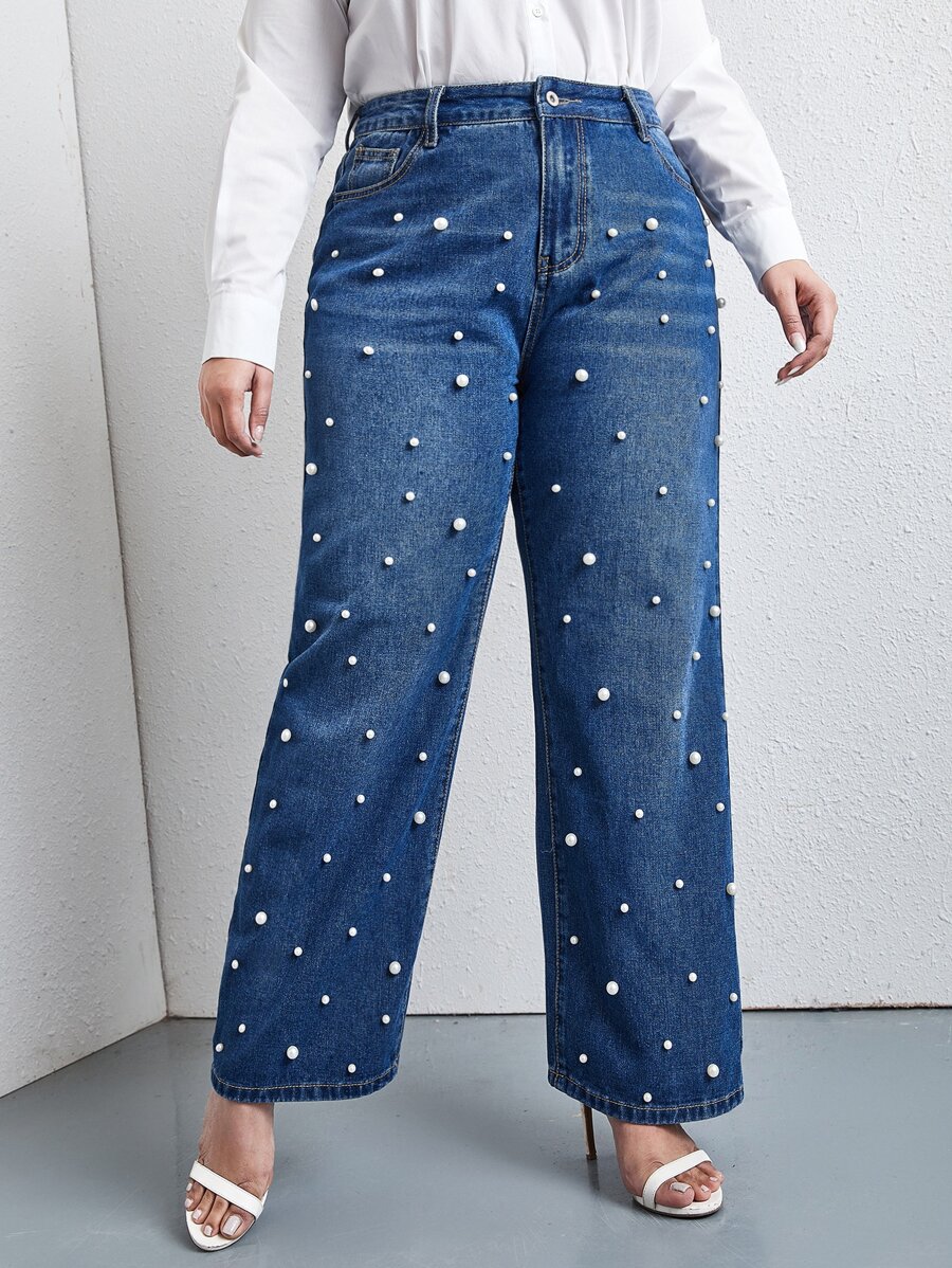 Plus Pearls Beaded Slant Pocket Straight Jeans