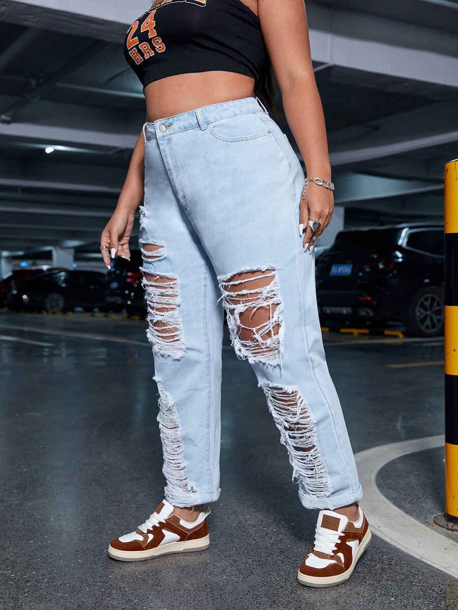 Plus Ripped Frayed Light Wash Mom Fit Jeans