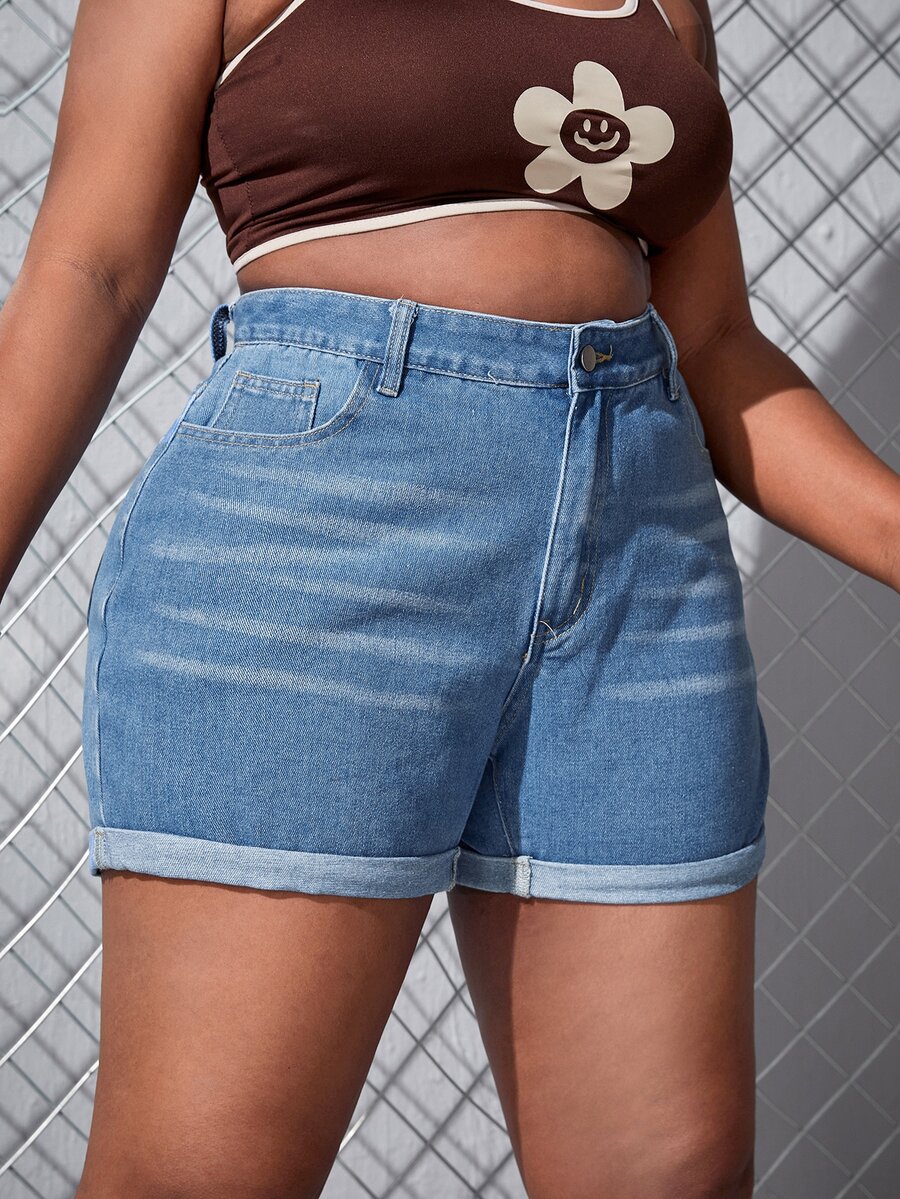Plus Roll Up Hem Slant Pockets Denim Shorts