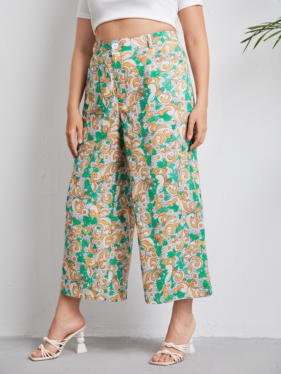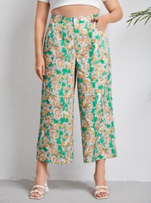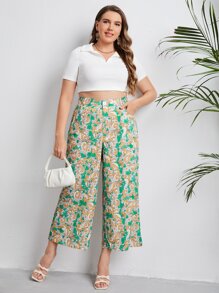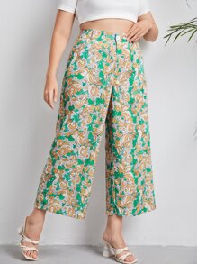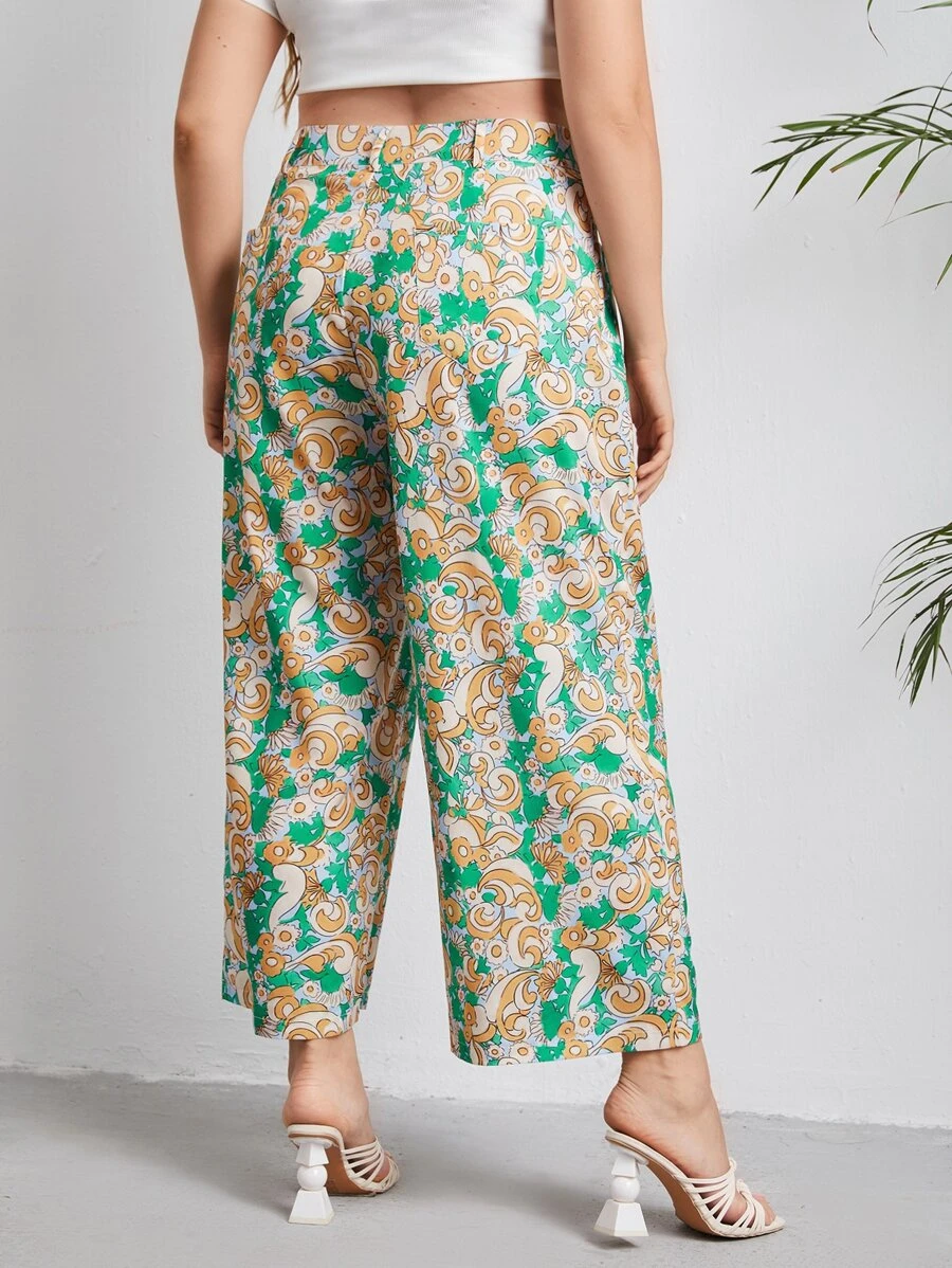 Plus Scroll & Floral Print Wide Leg Pants