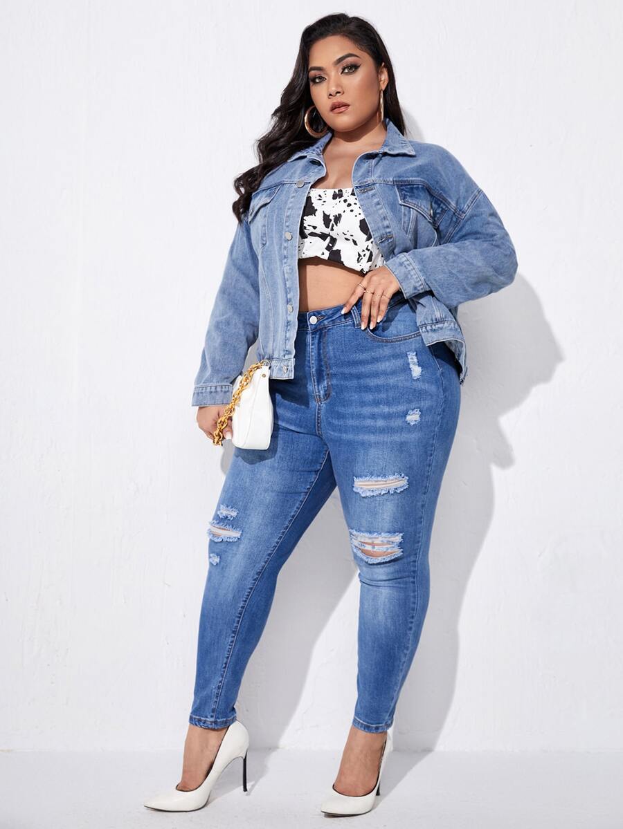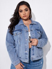 Plus Single Breasted Flap Pocket Denim Jacket