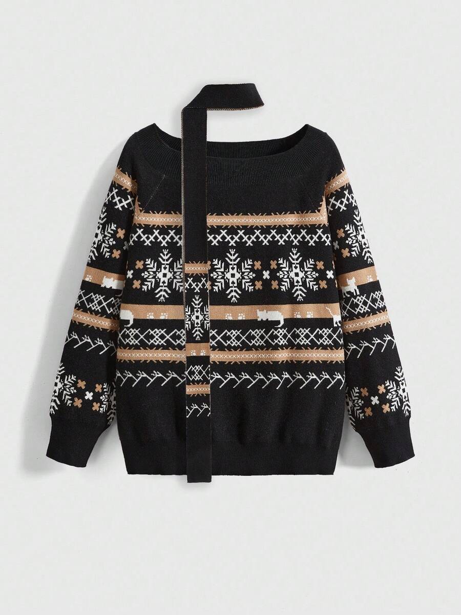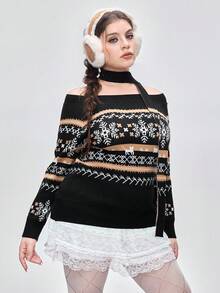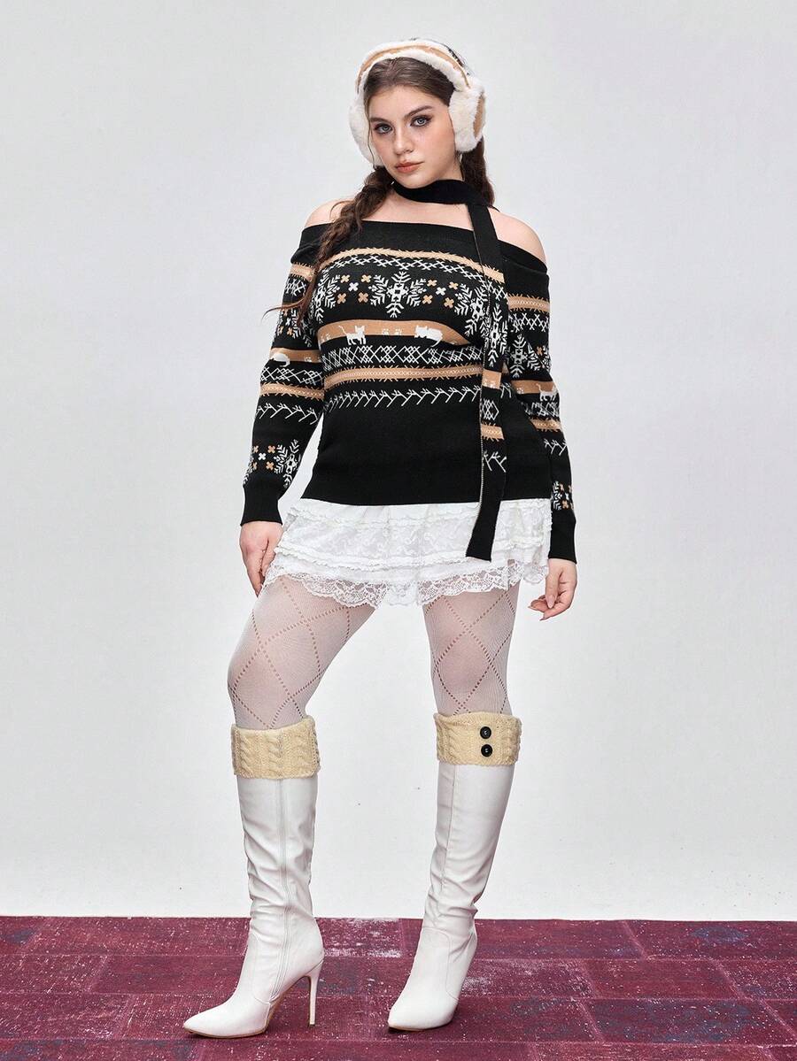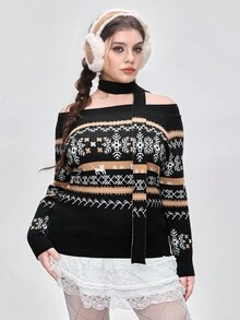Kawaii Plus Size Avant Garde Vintage Fair Isle Snowflake Christmas Kitty Intarsia Pattern Soft Feminine Cozy Winter Pullover Sweater, Plus Size Autumn/Winter Fair Isle Off Shoulder Tie-Neck Pullover Sweater, Plus Size Women's Autumn/Winter Pullover Sweater Top, Plus Size Vintage Christmas Party Fair Isle Pullover Sweater, Elegant Retro Holiday Party Sweater For Plus Size Women