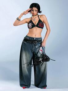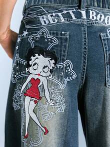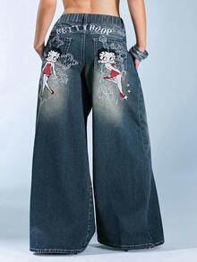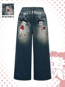 Betty Boop | ROMWE Plus Size Casual Washed Cartoon Figure Embroidered Wide-Leg Jeans