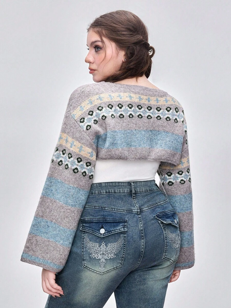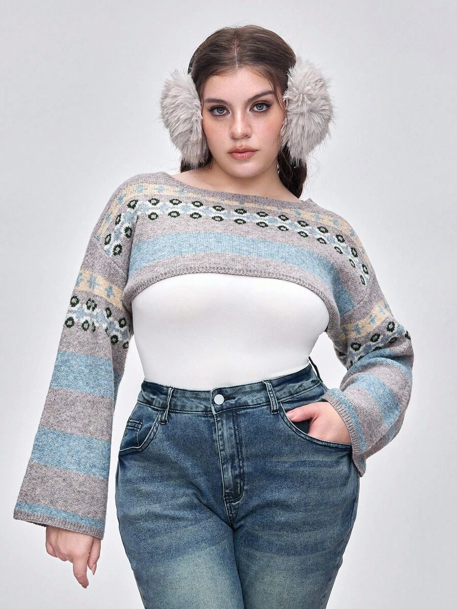 Kawaii Plus Size Crew Neck Fair Isle Pattern Cropped Sweater, Versatile For Autumn/Winter