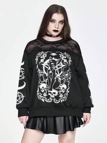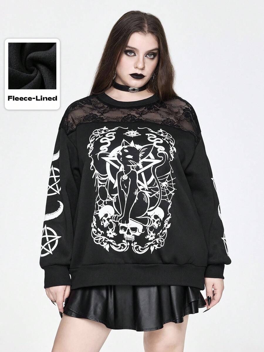 Goth Plus Size Gothic Black Cat Skull Moon Snake Jacquard Lace Patchwork Loose Plus Size Pullover Sweatshirt