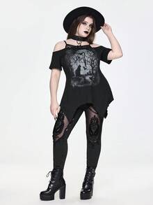 Goth Plus Size Gothic Dark Mysterious Bare Tree & Cat Print Asymmetrical Hem Top