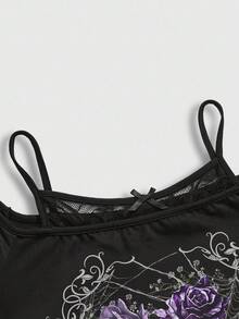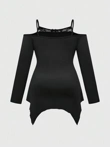 Plus Size Gothic Girl Mysterious Skull Rose Print Asymmetrical Hem Off Shoulder Lace Camisole Black Long Sleeve T-Shirt