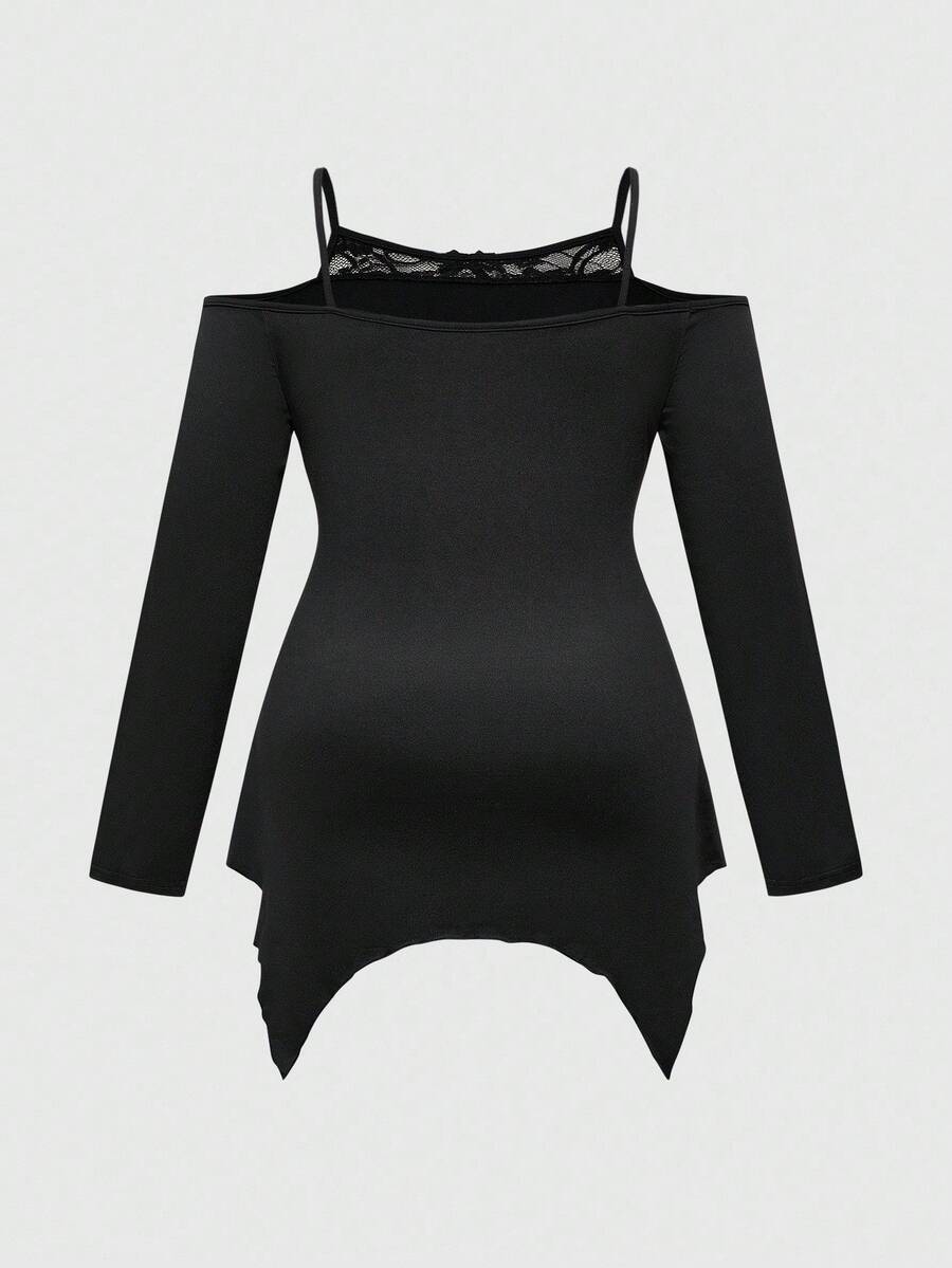 Goth Plus Size Gothic Girl Mysterious Skull Rose Print Asymmetrical Hem Off Shoulder Lace Camisole Black Long Sleeve T-Shirt