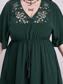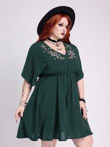 Goth Plus Size Gothic Hippie Vacation Style Black Star & Moon Plant Snake Skin Embroidery Dress