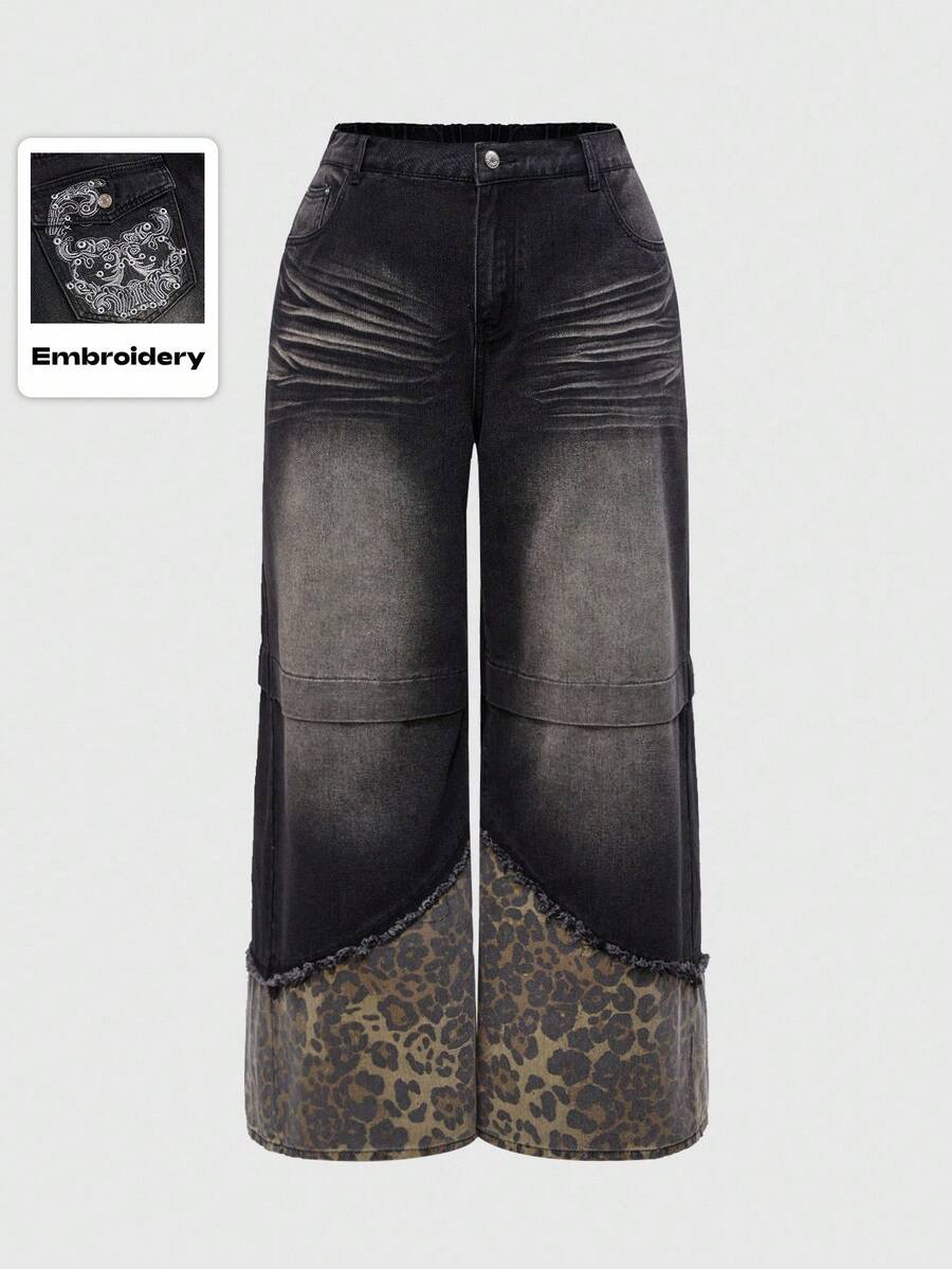 Goth Plus Size Gothic Street Vintage Patchwork Leopard Skull Embroidery Jeans, Loose Version Autumn/Winter Bottoms For Plus Size Women, Distressed Frayed Relaxed Fit Wide Leg Jeans